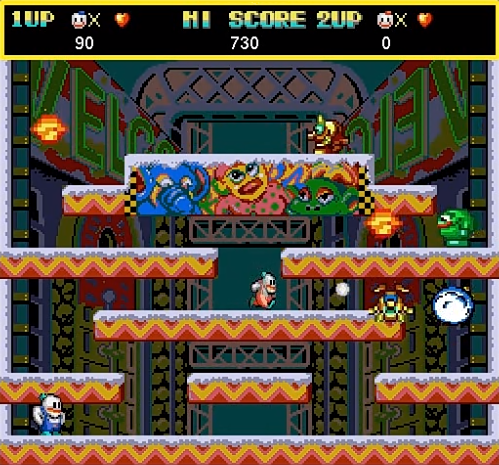 En el primer ejercicio de ellos, hemos rendido tributo a un archiconocido 2D del mundo de las recreativas. El mítico Snow Bros de la ya desaparecida Taoplan que, entre otros, también desarrolló el famoso Out Zone y que también fue enunciado de ejercicio en otros semestres junto a Vampire Killer y Bubble Bobble. Sí, en esta asignatura nos dedicamos a rendir homenajes a juegos que han marcado una época. Juegos hoy en día considerados difíciles, normales diría yo, que no tienen nada que ver con los más jugados de hoy en día.